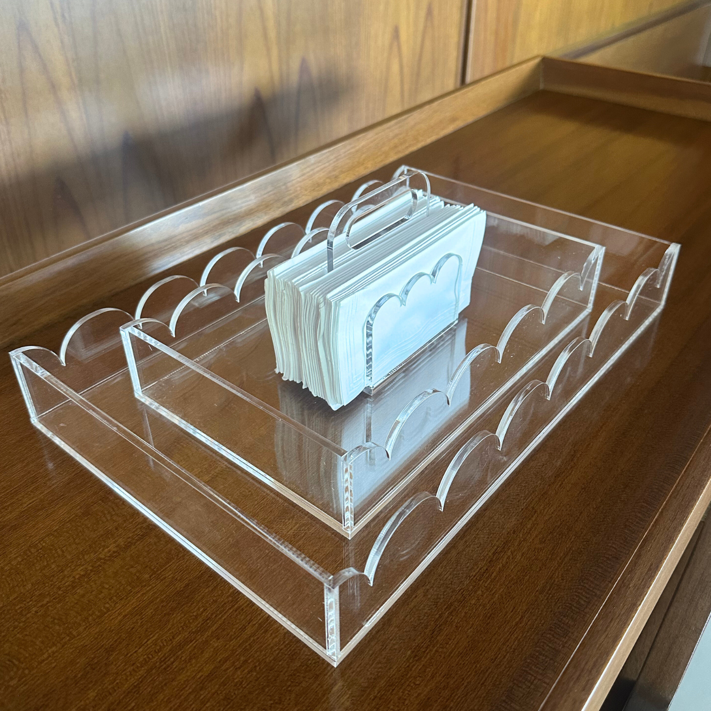 Desenvolvida em acrílico cristal, a Coleção Nuvem combina bordas onduladas com linhas retas, criando um contraste harmonioso que une delicadeza orgânica e contemporaneidade. O porta guardanapos traz o o encontro perfeito entre curvas e linhas, trazendo um toque diferente ao servir e receber.