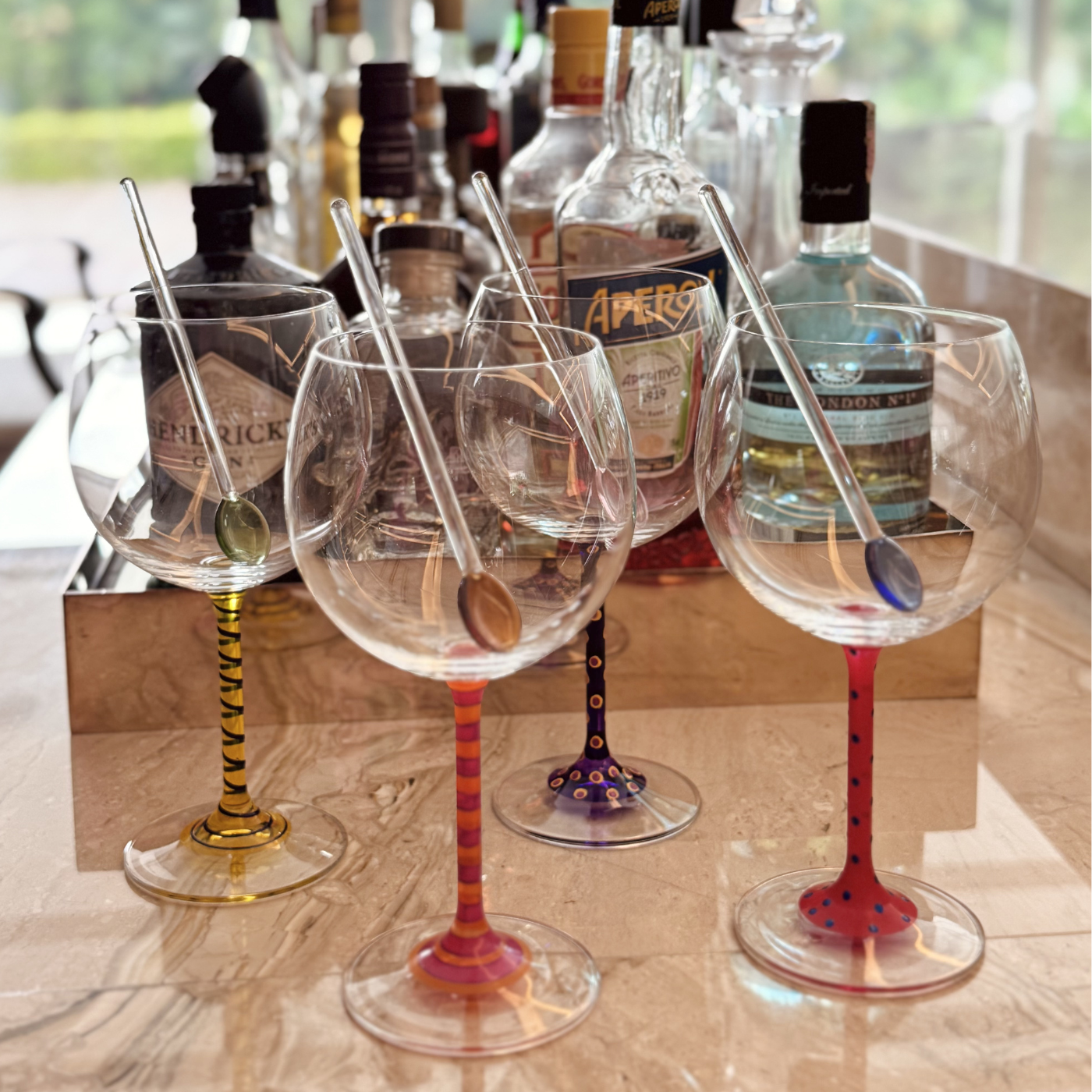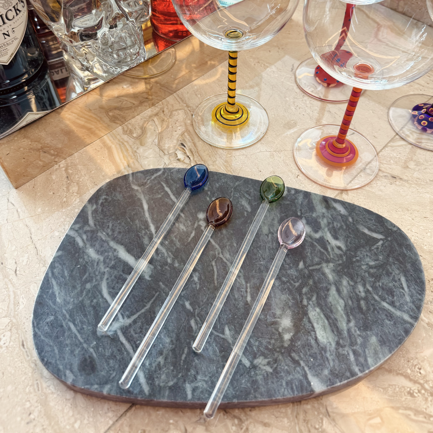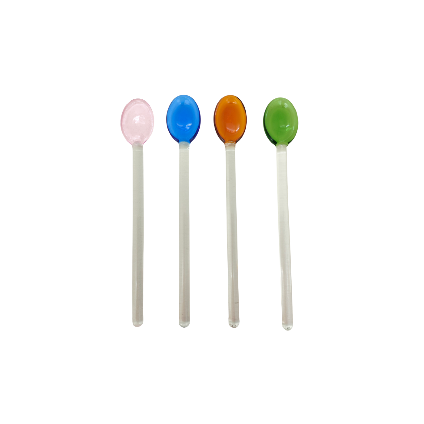 Set 04 Colher Drink Joy, em vidro borossilicato, com design moderno e acabamento translúcido. Cada colher traz uma tonalidade vibrante para quem busca uma estética minimalista na coquetelaria.