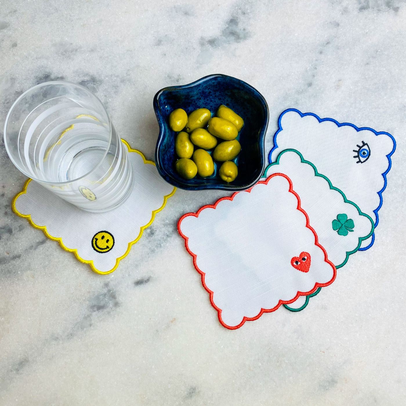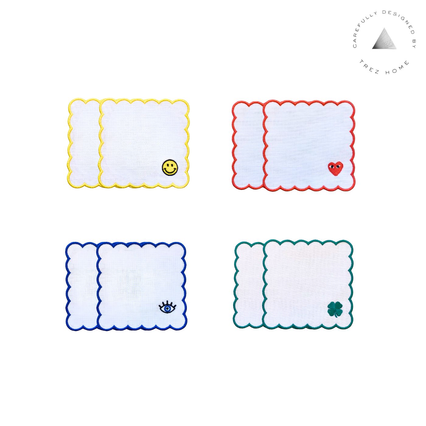 O set acompanha 2 unidades de cada emoji (2 de coração, 2 de smile, 2 de trevo e 2 de olho grego), permitindo uma composição super descontraída, além de vir com uma caixa acrílica para guardar os guardanapos com praticidade e charme.