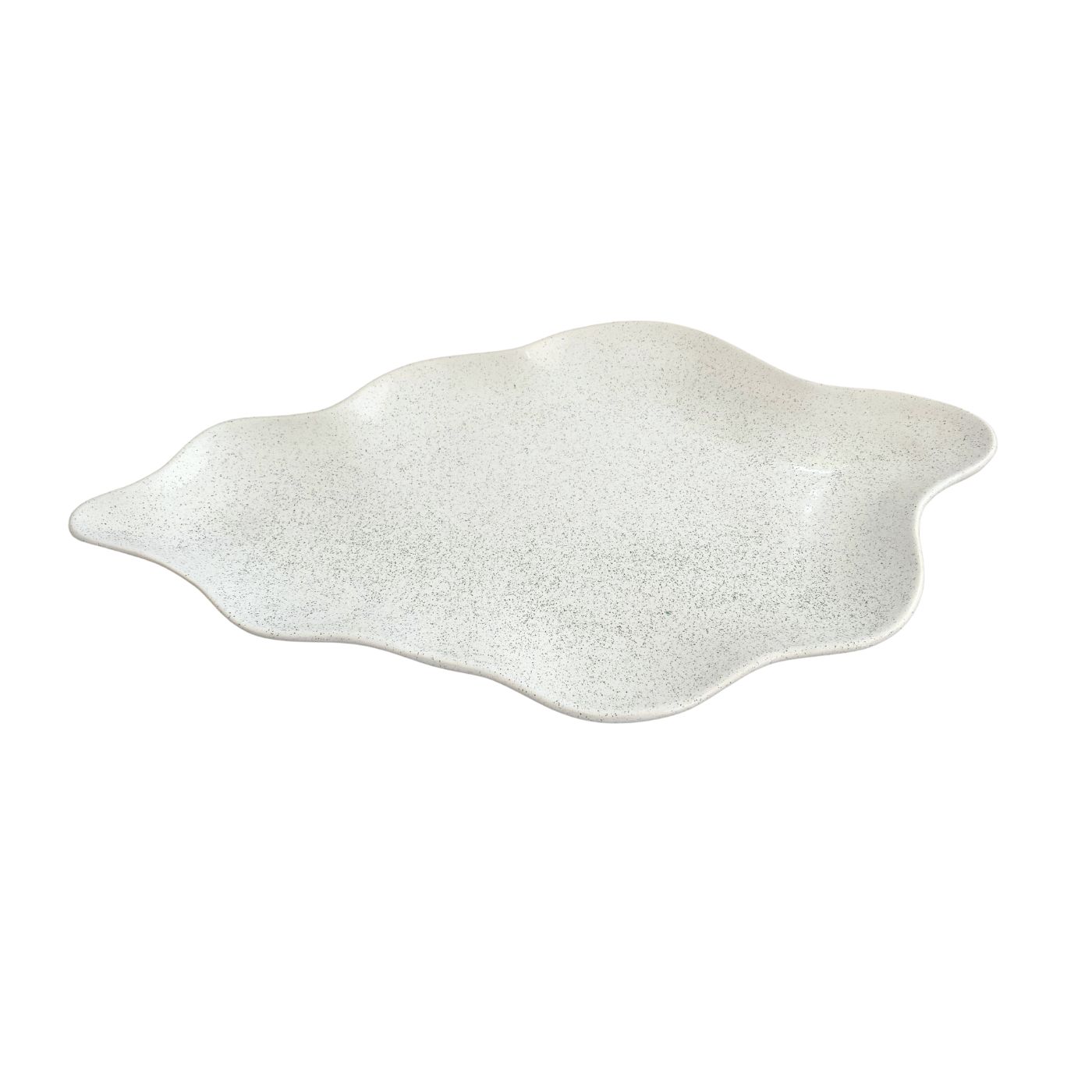 Travessa Contorno em cerâmica com formas orgânicas e acabamento off-white, suavemente pontuado por pequenos detalhes pretos inspiradas nas linhas suaves das folhas e das ondulações naturais. Um trabalho artesanal que transforma a mesa em cenário e une funcionalidade à estética.