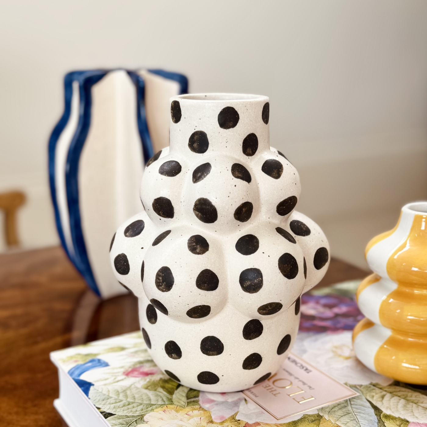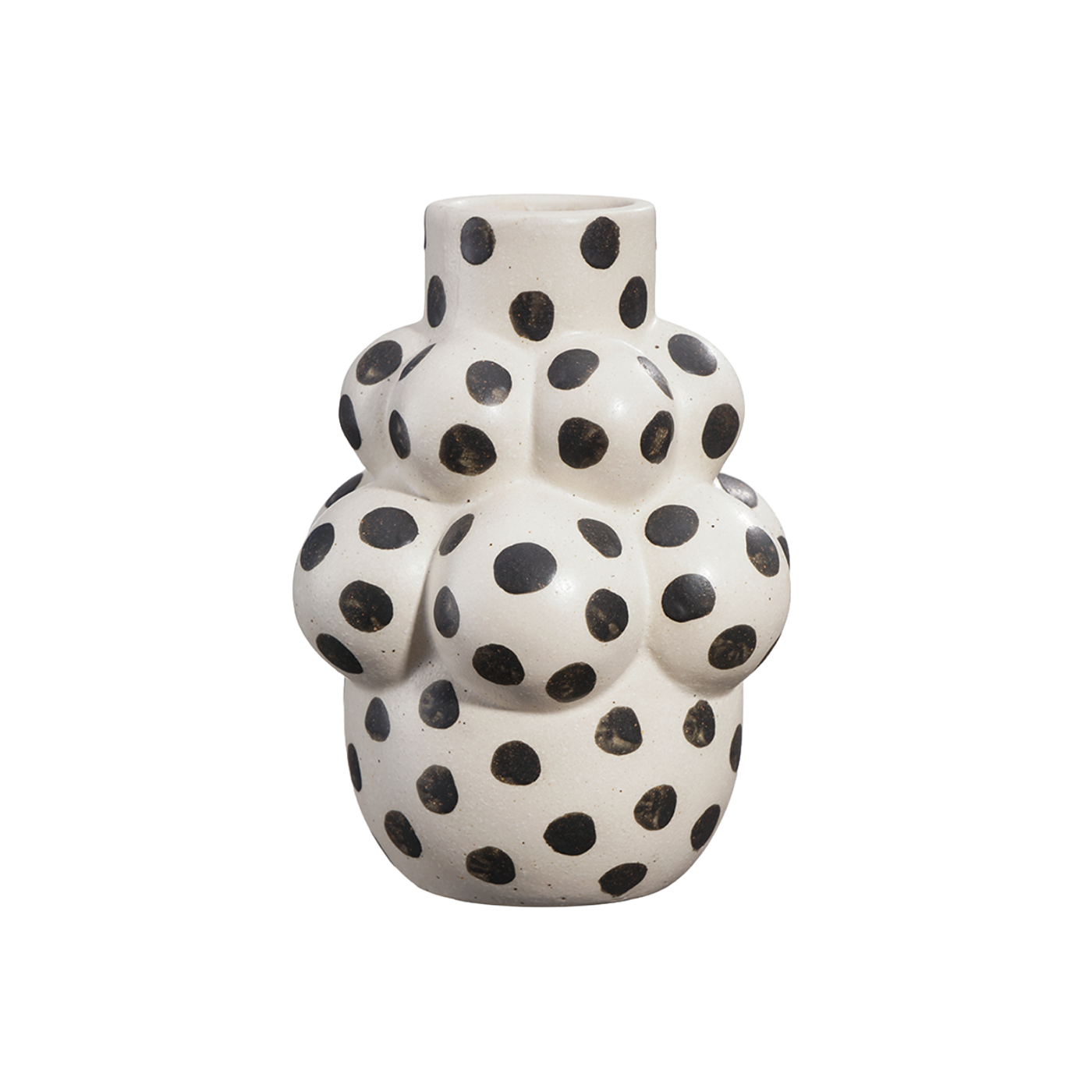 Vaso Dália Poá em cerâmica traz volumes suaves em uma silhueta escultórica, enquanto as formas arredondadas criam um jogo de luz e sombra e os poás adicionam leveza e personalidade. Ideal para compor ambientes com identidade