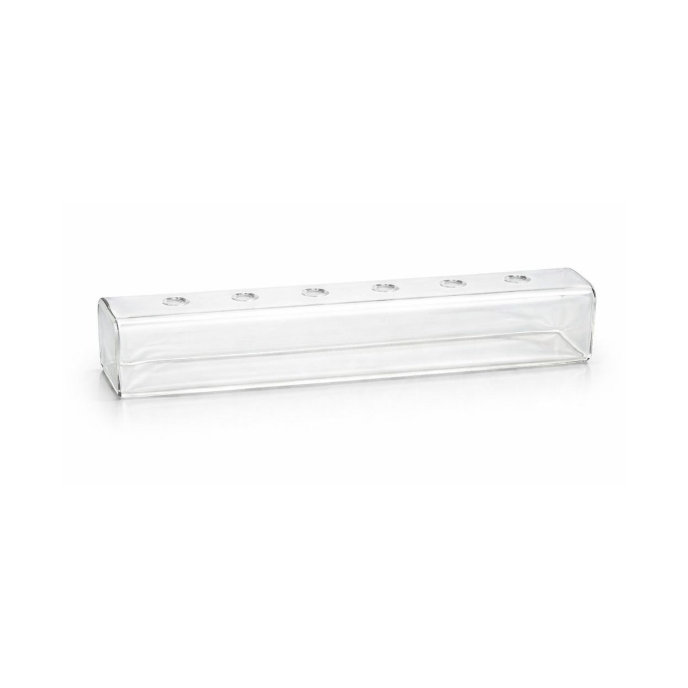 Vaso Horizontal Armoni M feito em vidro borossilicato, perfeito para quem ama decorar com leveza e criatividade. Possui um design alongado na horizontal e conta com 6 furos circulares, ideais para acomodar flores ou criar composições com água e elementos decorativos.