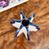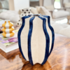 Vaso Zuri em cerâmica, com acabamento off white e detalhes laterais em azul. Suas curvas criam movimento e leveza, resultando em uma peça contemporânea que se destaca tanto como elemento decorativo quanto em composições com arranjos florais.